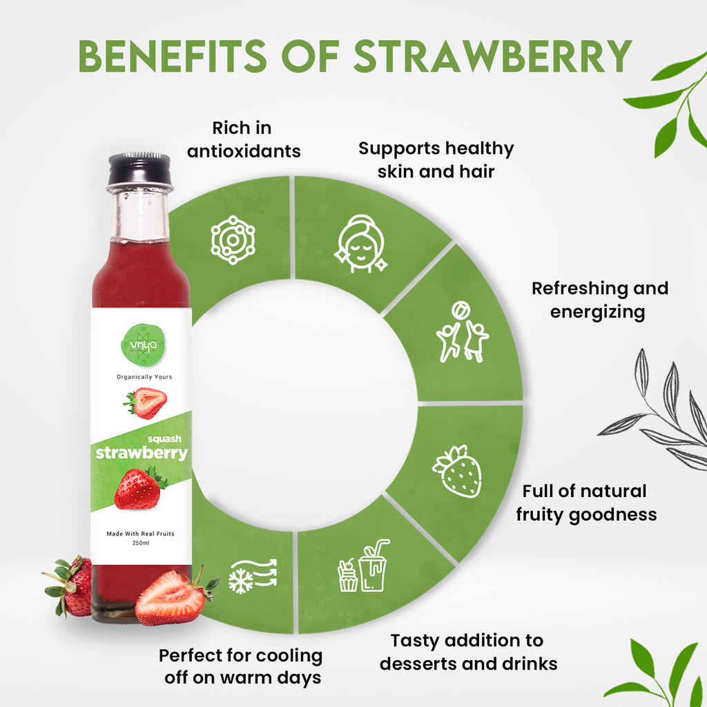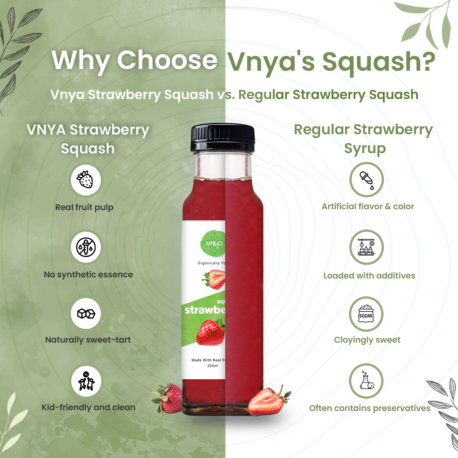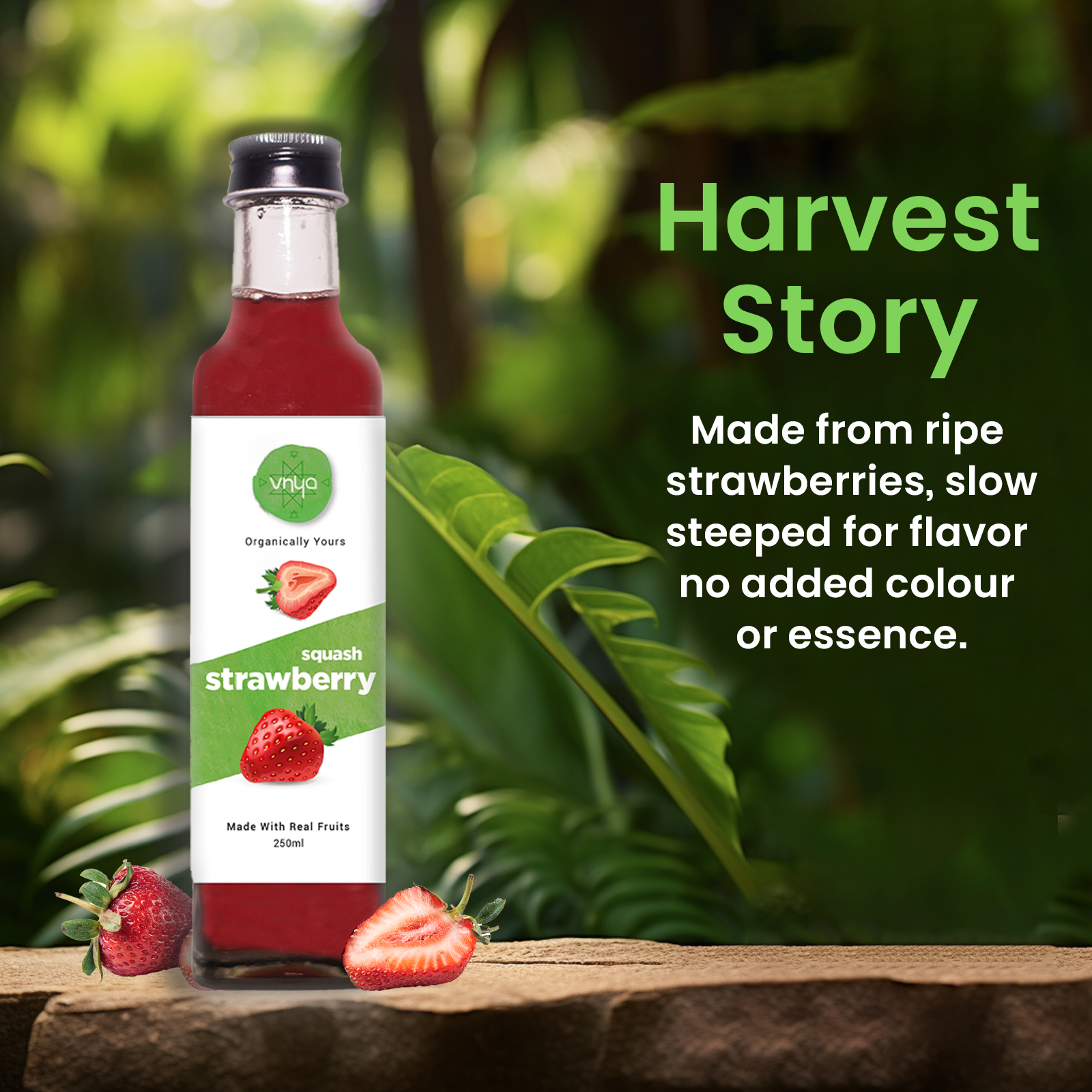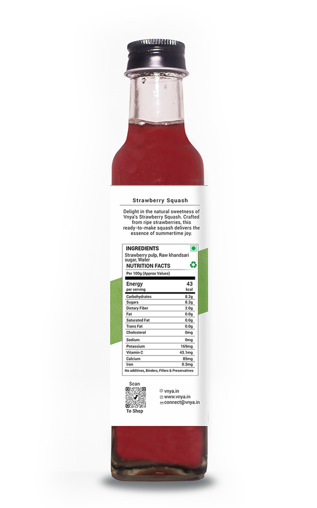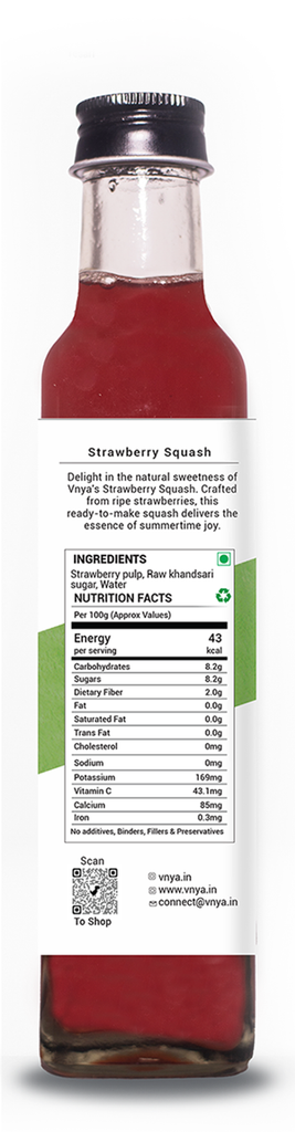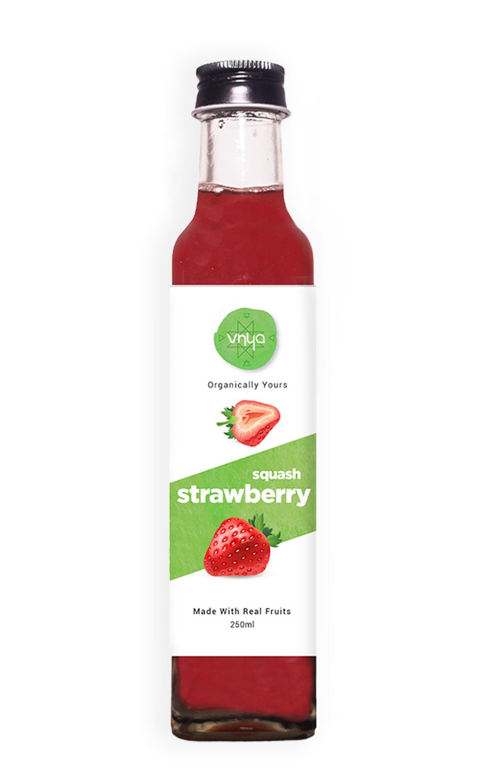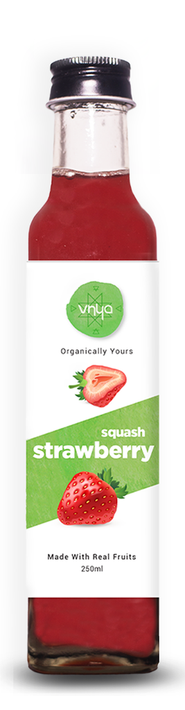 Vnya’s Strawberry Squash is extracted from naturally grown strawberries. Made using organic Khandsari Sugar without the use of any artificial flavours or colour.
